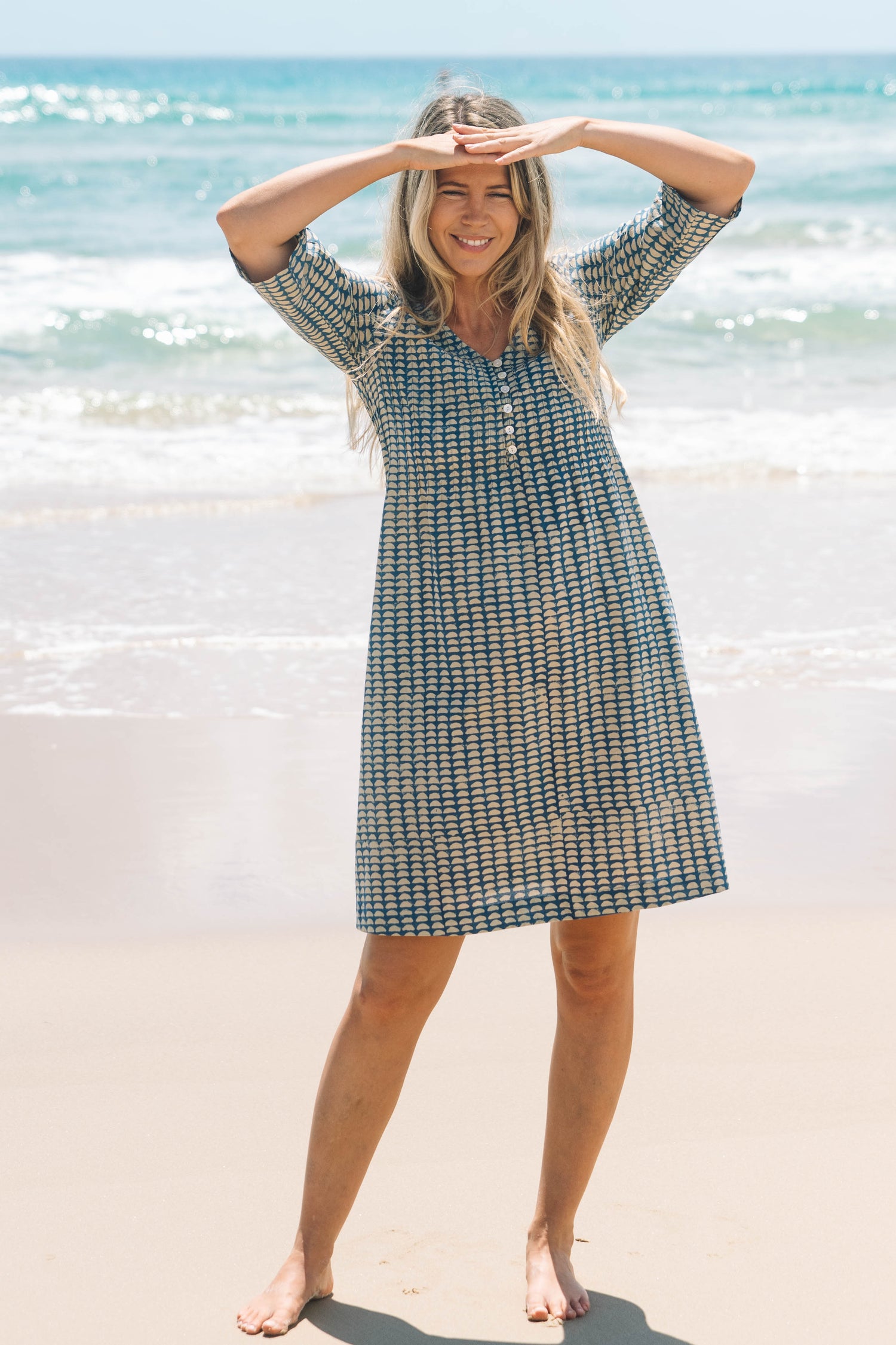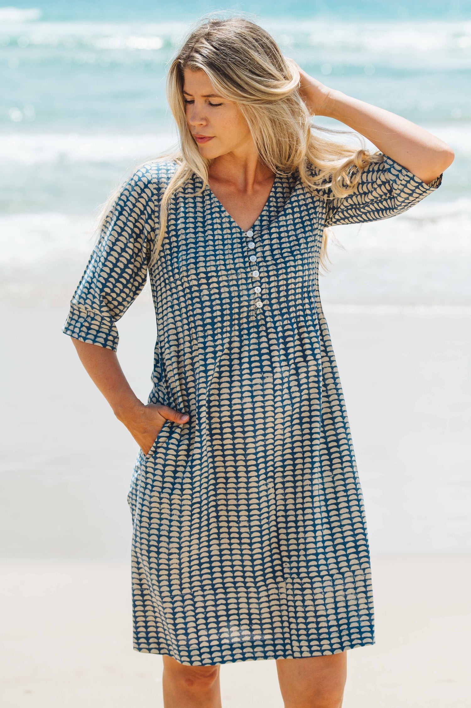 Ananya is a fresh take on our bestselling Fleur Dress.  Love a V neck ? this dress will work every time when you don't know what dress to wear !  We all love a little room to move and our clever pintucked bodice ensures you don't lose your feminine shape. This print has been designed to have a soft ancient feel about it.