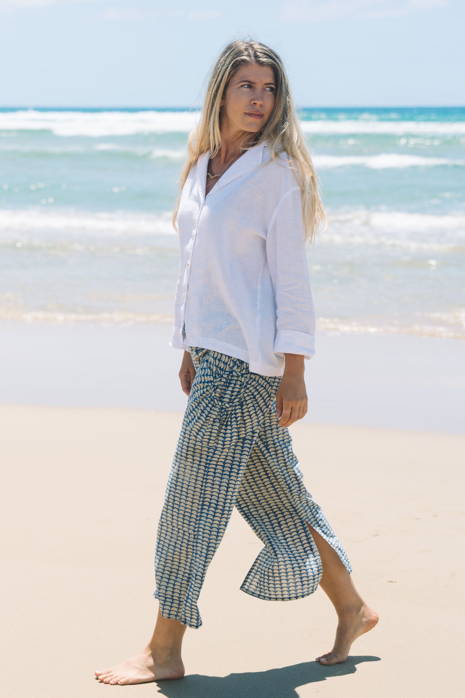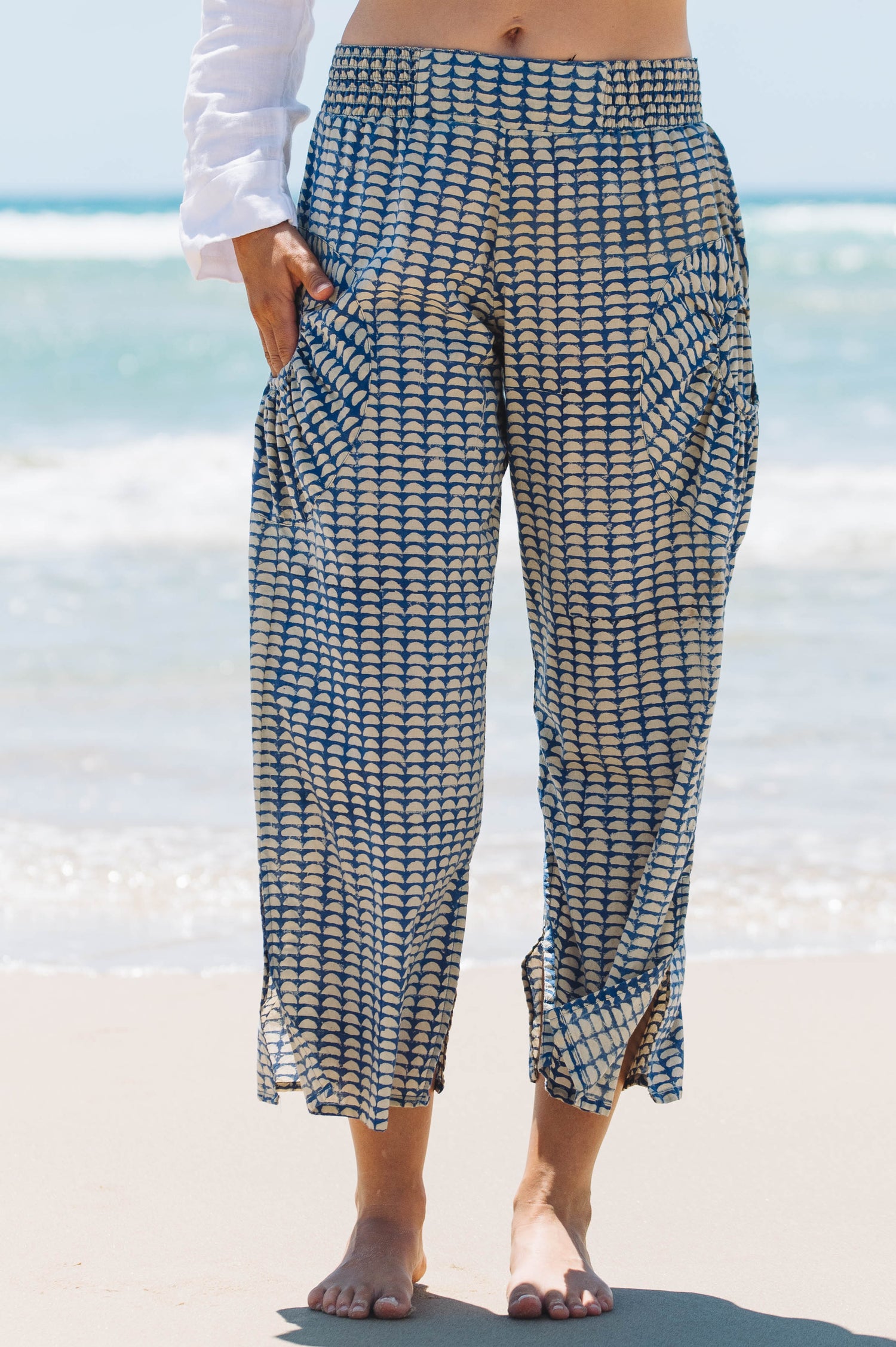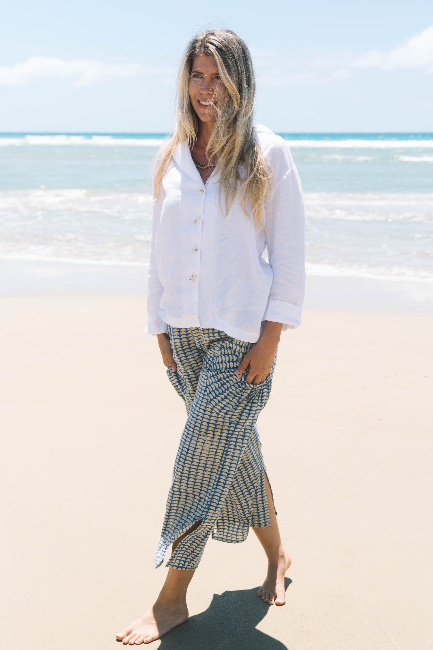 Jaya is Zen in a cotton pant with a relaxed fit, a soft shirred waistband, pocket detail and side splits. Need a more narrow leg? Simply tie the sides.
