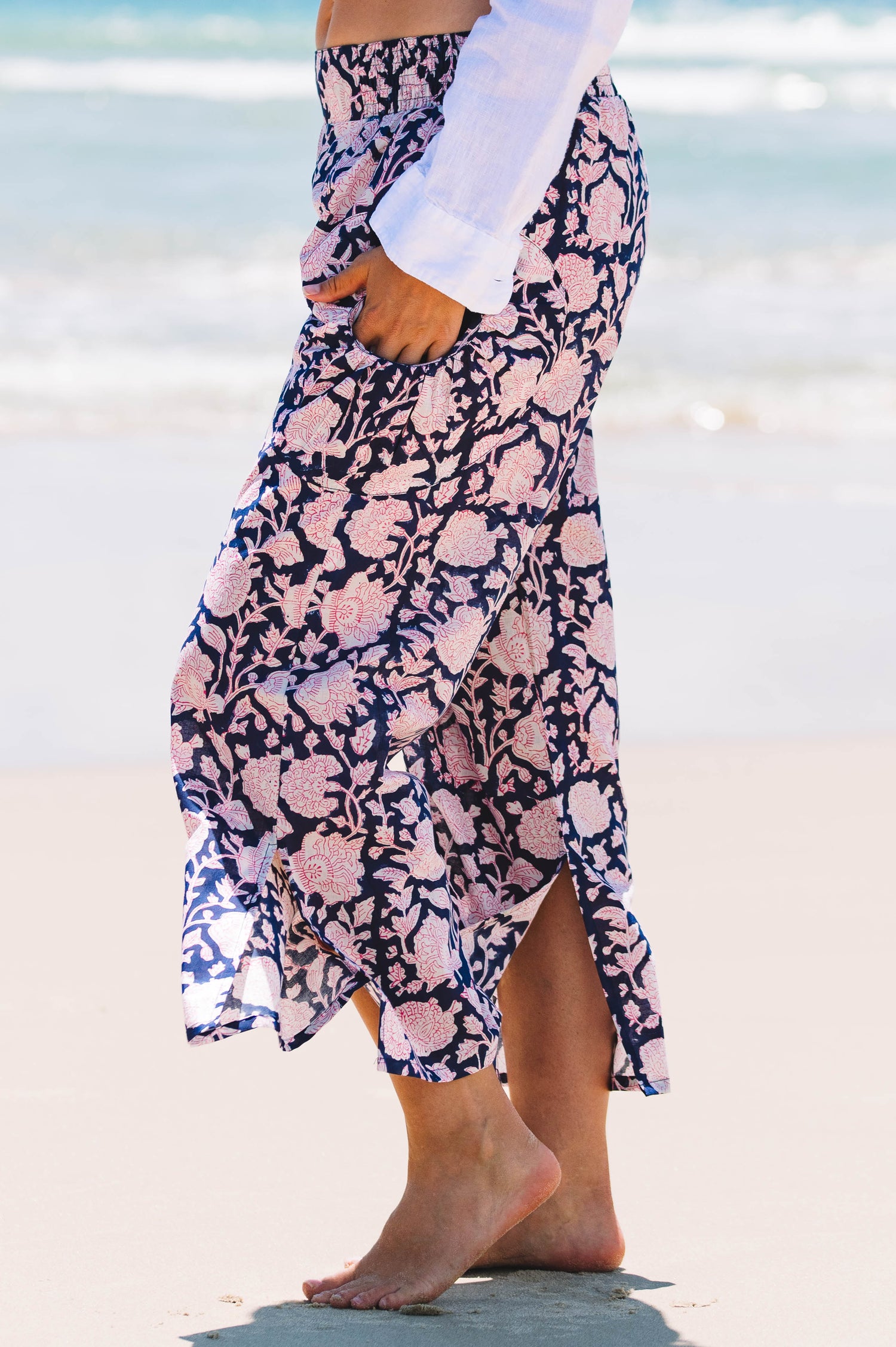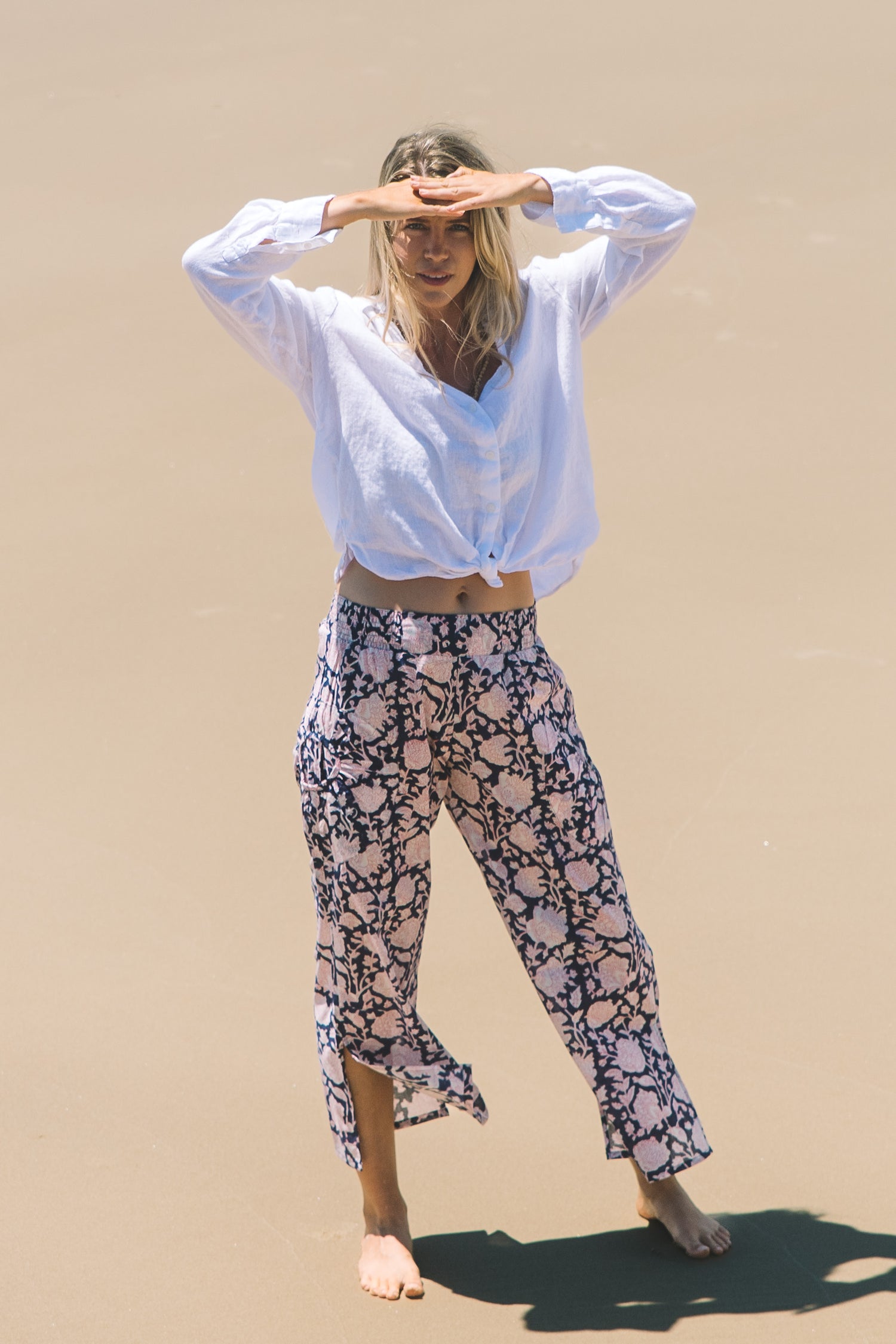 Jaya is Zen in a pant...relaxed fit, with a soft shirred waistband, fun pocket detail and side splits. Need a narrower leg? Simply tie the sides. Choose your regular pant size but if you prefer a more fitted look choose one size down.